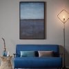 Este cuadro, que contiene un lienzo de línea minimalista, dará ese toque de color que tanto agradece una pared lisa. En medio de un fondo de tonos azules, se cruza un trazo de lámina dorada que, además de color, da luminosidad al cuadro. Además de es